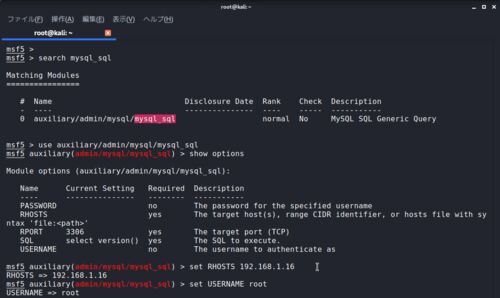 Hello there, ('ω')ノ 前回、データベーススキーマに関する情報が得られたので。 下記のモジュールをつかって、SQLコマンドを実行することに。 auxiliary / admin / mysql / mysql_sql デフォルトオプションで設定されているSQLが実行されて。 SQLオプション…