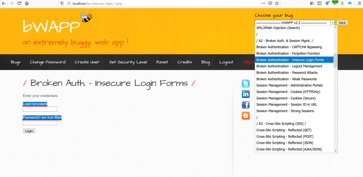 A2 ⇨ Broken Auth - Insecure Login Formsを選択して。