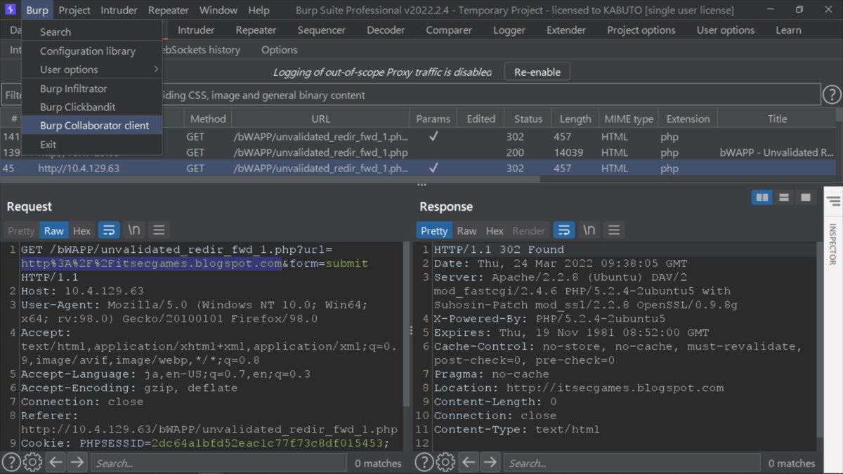 新たにcopy to clipboardで、Collaboratorのドメインをコピーして貼り付けると。